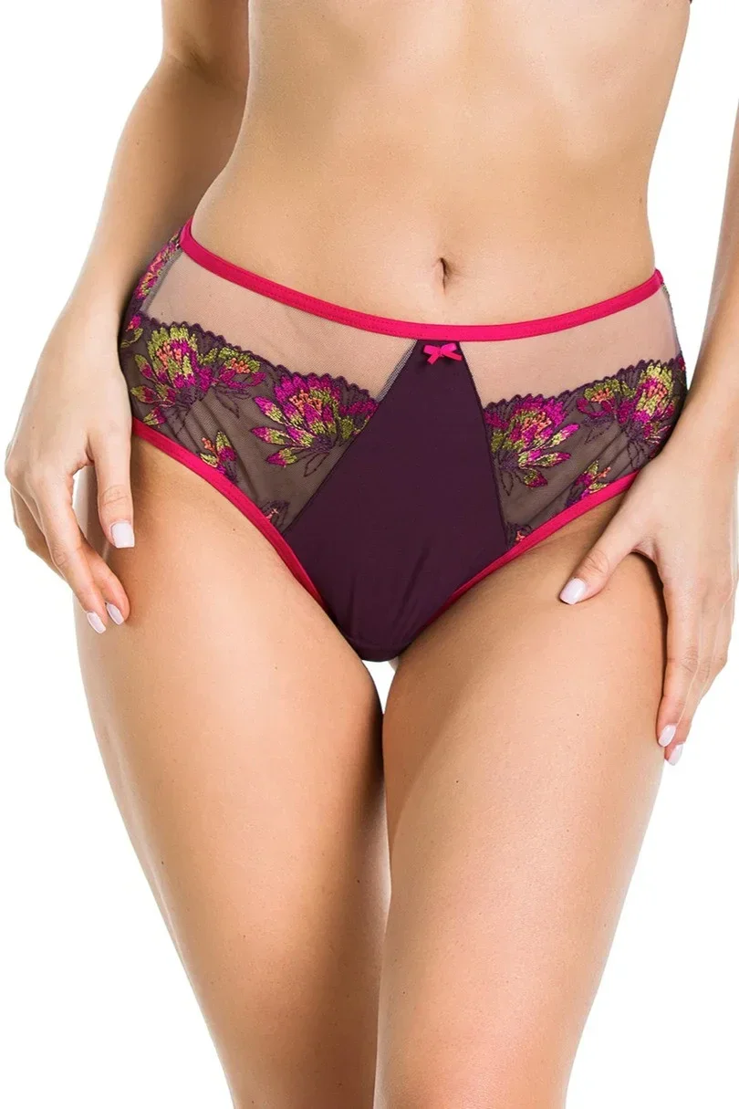 Přední díl je zdoben krásnou výšivkou, zadní díl je z dvojitého tylu ve fialové barvě, okraje jsou zakončeny amarantinovým lemem