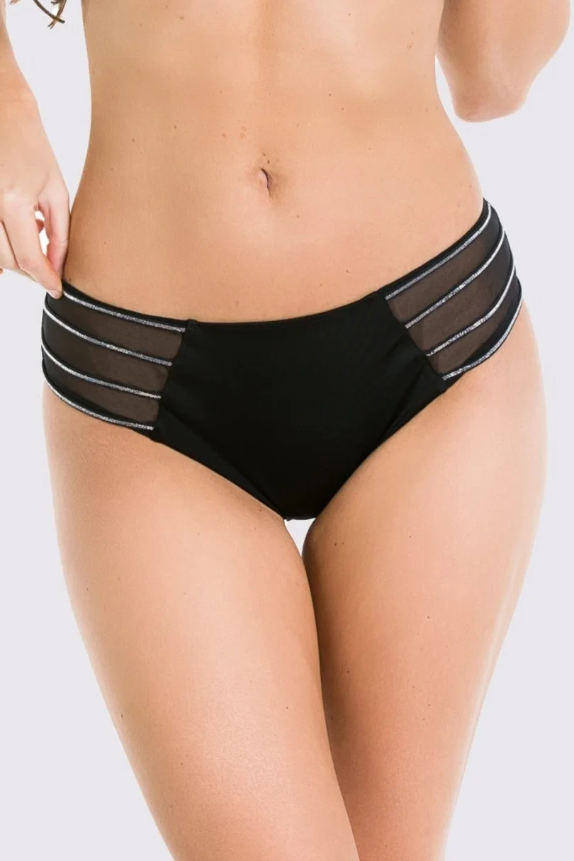 Klasické kalhotky z černého mikrovlákna, boky z tylu zdobené stříbrnými proužky.