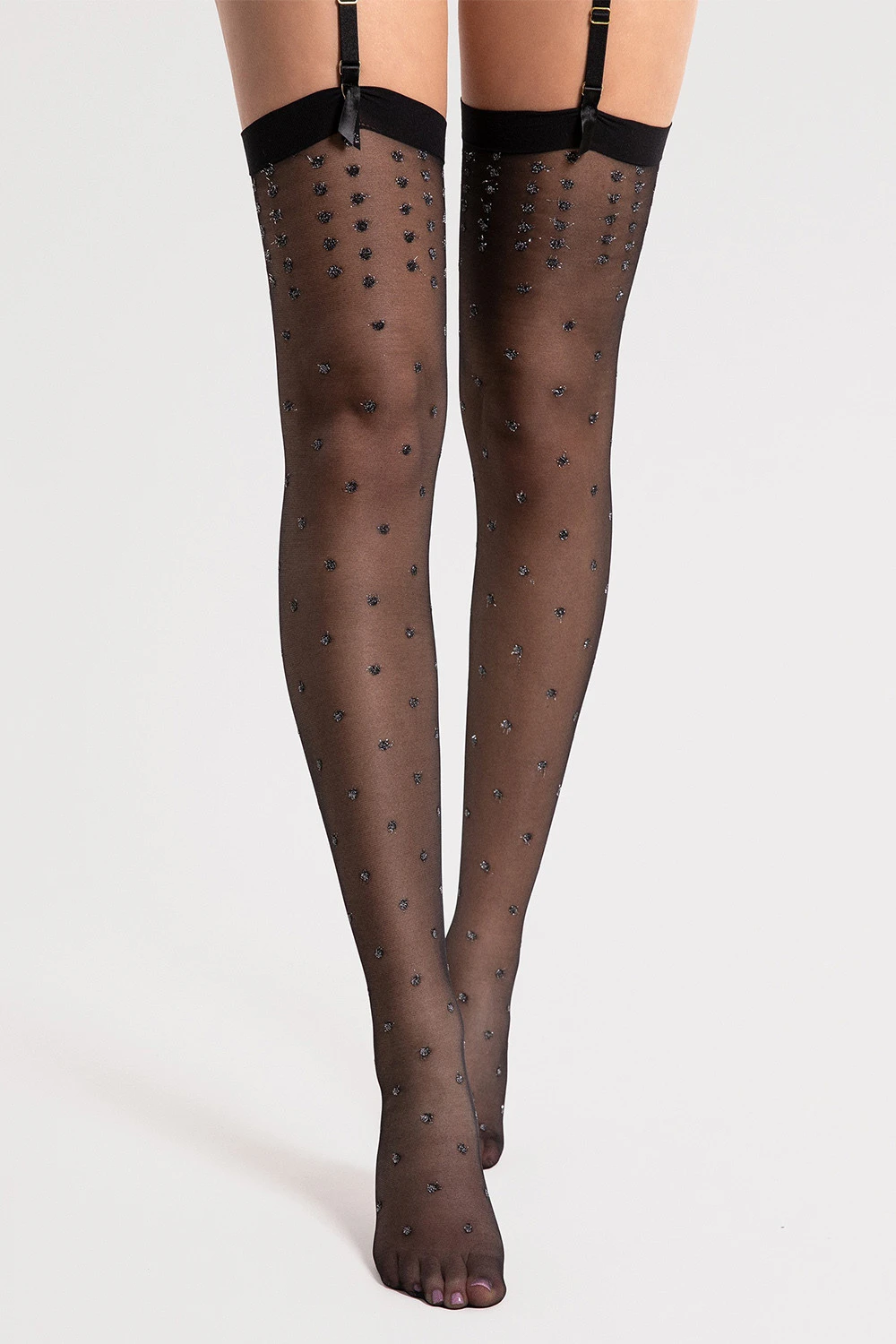 Punčochové zboží značky Fiore, model Bruine 15 DEN O4101, vyrobeno z 86% polyamidu, 10% elastanu, 4% metalizované příze, bez vyznačených špiček, tloušťka: 15 DEN, dámský výrobek.
