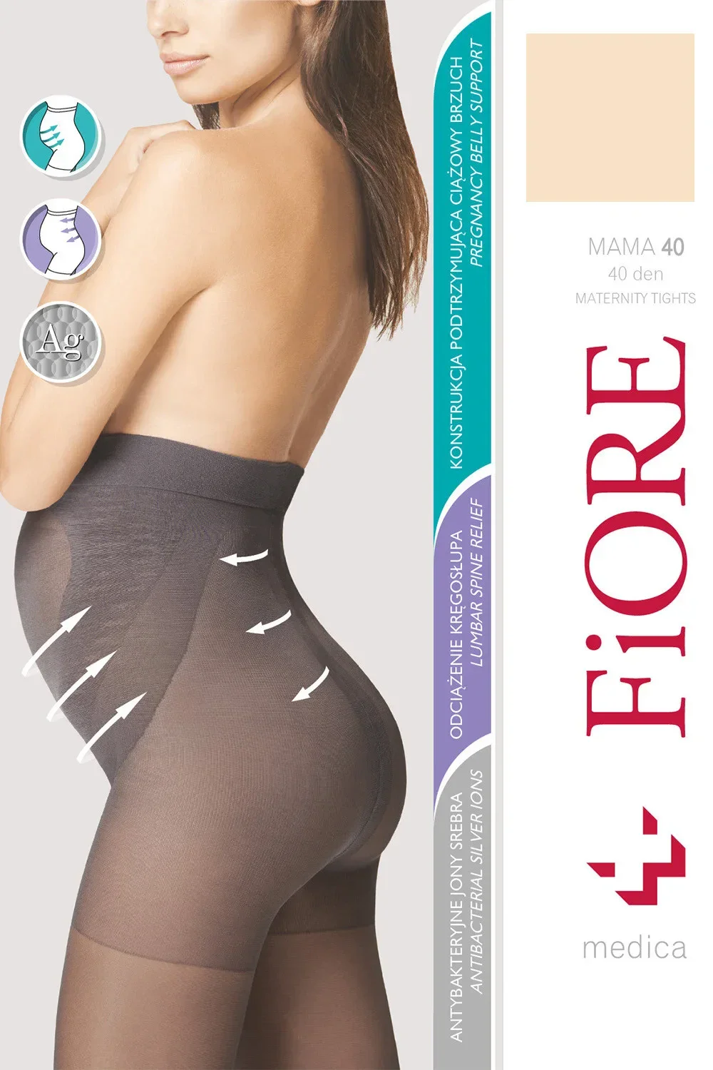 Punčochové zboží značky Fiore, Model Mama 40 den M5209, vyrobeno z 80% polyamidu, 20% elastanu, bez vyznačených špiček, těhotenské oblečení, tloušťka: 40 DEN, dámské oblečení, označené kalhotky.
