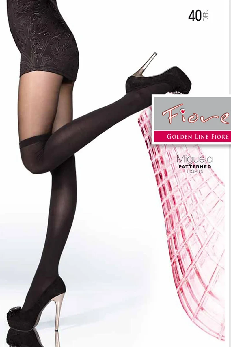 Punčochové zboží značky Fiore. Model Miguela 40 DEN. Výrobek je vyroben z 87 % polyamidu, 12 % elastanu, 1 % bavlny. Vlastnosti výrobku: sexy imitace punčoch. Bez vyznačených prstů. Tloušťka: 40 DEN. Dámský výrobek.