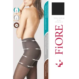 Punčochové zboží značky Fiore, model Total Slim 40 den M5207, vyrobeno ze 79% polyamidu, 19% elastanu, 2% bavlny, bez vyznačených špiček, tloušťka: 40 DEN, dámský výrobek, označené kalhotky.