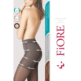 Punčochové zboží značky Fiore, model Total Slim 40 den M5207, vyrobeno ze 79% polyamidu, 19% elastanu, 2% bavlny, bez vyznačených špiček, tloušťka: 40 DEN, dámský výrobek, označené kalhotky.