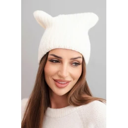 Dámská zimní čepice s vlnou v kočičím střihu z žebrovaného úpletu K419 ecru