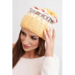 Dámská zimní čepice s vlnou a nápisem s velkým bambulí K422 musardová
