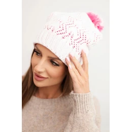 Dámská zimní čepice s vlnou v ozdobném pletení s bambulí K467 bílá + růžová