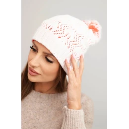 Dámská zimní čepice s vlnou v ozdobném pletení s bambulí K467 bílá + oranžová