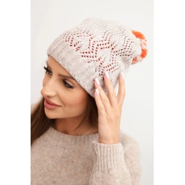 Dámská zimní čepice s vlnou v ozdobném pletení s bambulí K467 béžová