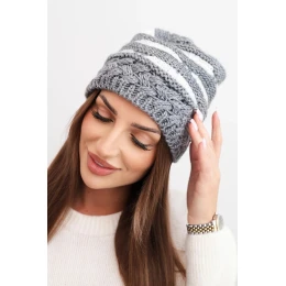 Dámská zimní čepice z vlny v hrubém pletení a pruhy K465 šedá + bílá
