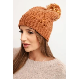 Dámská zimní čepice s vlnou ve zdobném pletení s bambulí K467 hnědá