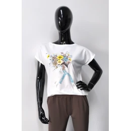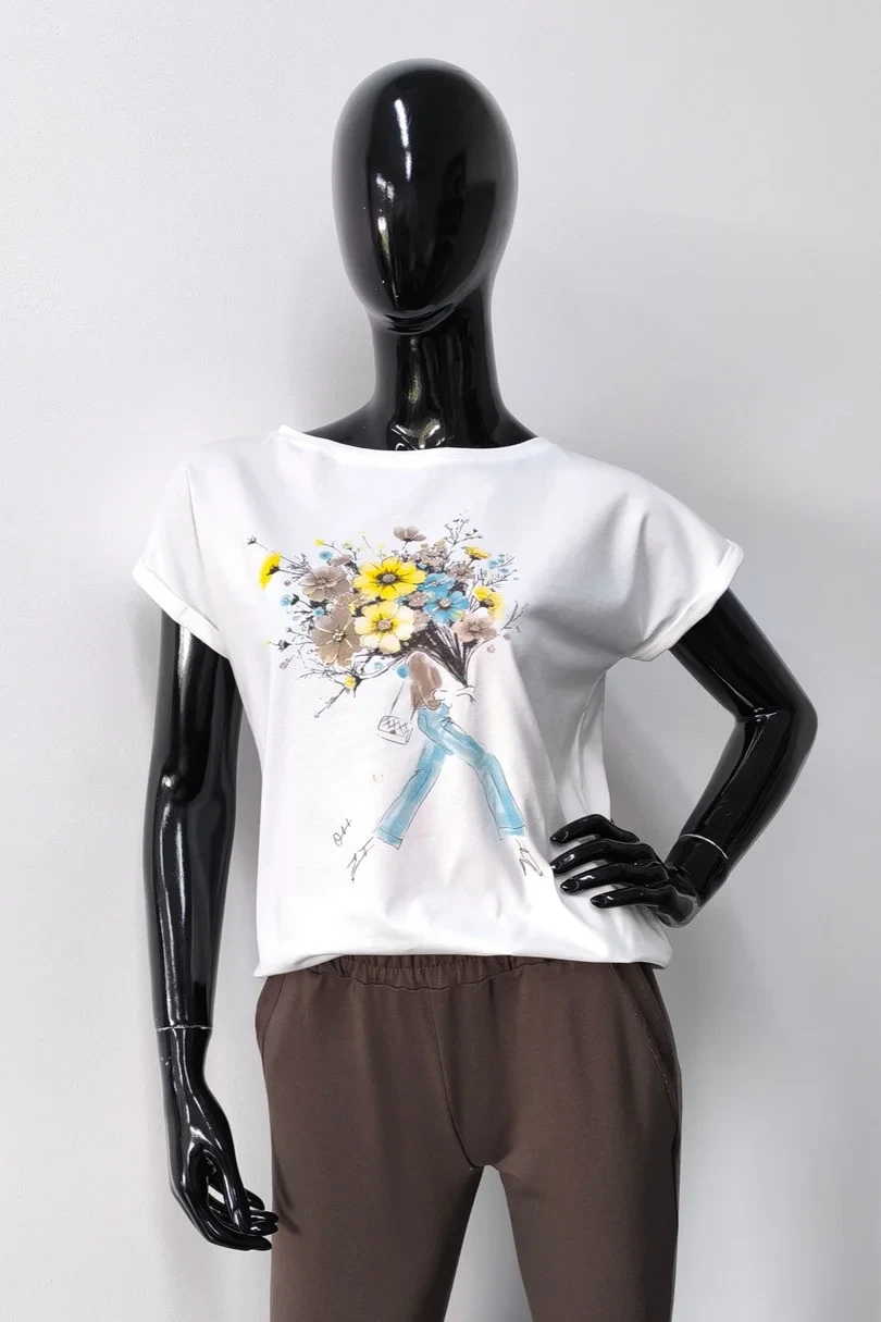 Stylowa i wygodna bluzka damska z krótkim rękawem to doskonały wybór na co dzień. Rękawy zakończone subtelnym wywinięciem nadają jej modnego charakteru, a asymetryczny fason z lekko zaokrąglonym, wydłużonym tyłem zapewnia komfort noszenia i swobodę ruchów. Przód zdobi kolorowy nadruk wzbogacony błyszczącymi elementami, które dodają bluzce unikalnego wyglądu. Wykonana z wysokiej jakości bawełny z dodatkiem elastanu, dzięki czemu jest przewiewna, miękka i doskonale dopasowuje się do sylwetki. Idealna do jeansów, spódnic i casualowych stylizacji!