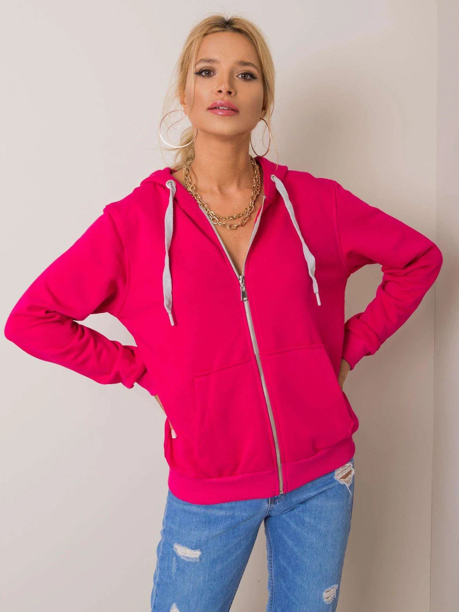 Fuchsiová bavlněná mikina s kapucí.