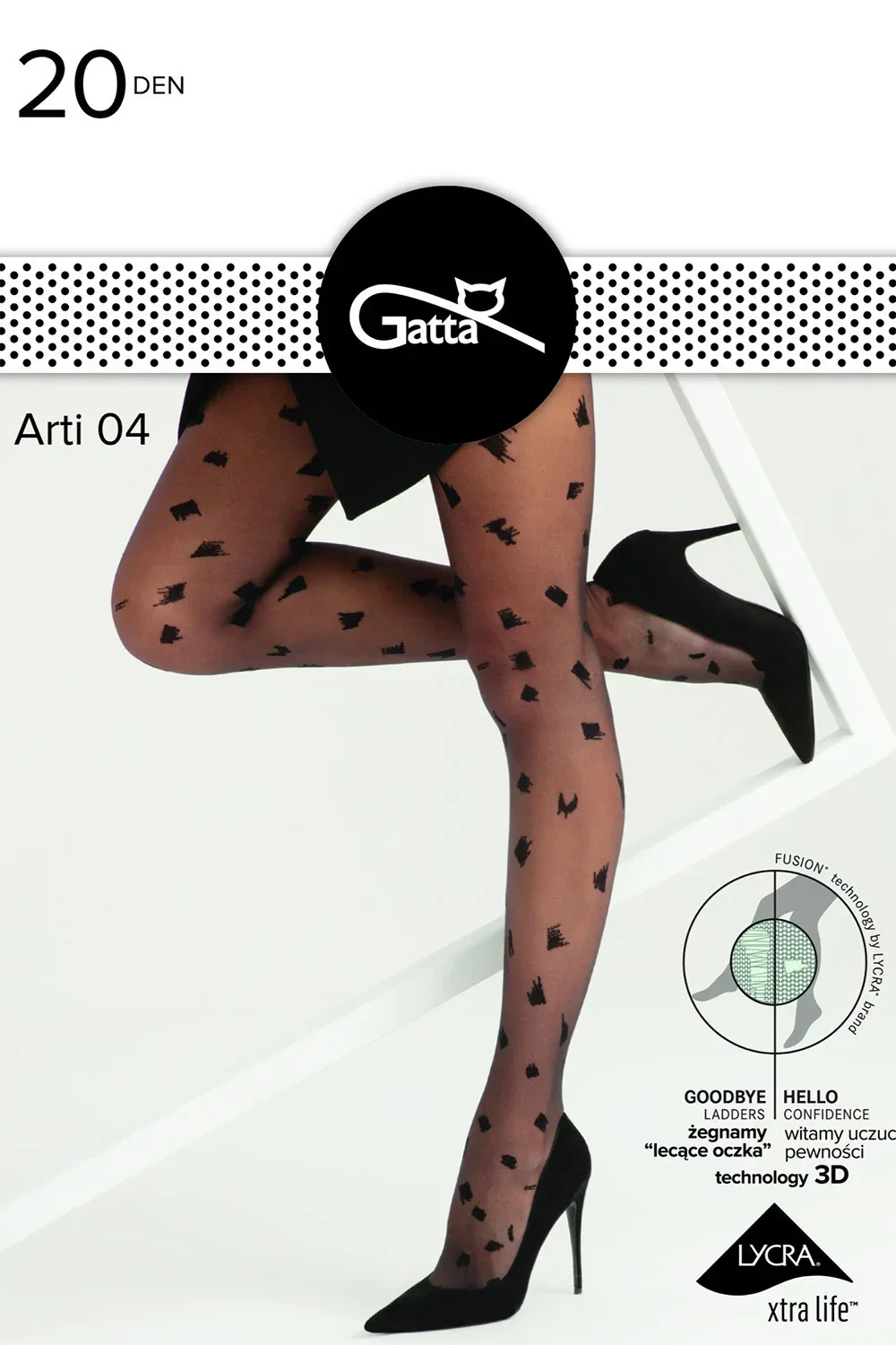Punčochové zboží značky Gatta, model Arti 04 20 DEN, vyrobeno z 81% polyamidu, 19% elastanu, bez vyznačených špiček, 20 DEN, dámský výrobek, bez vyznačených kalhotek.