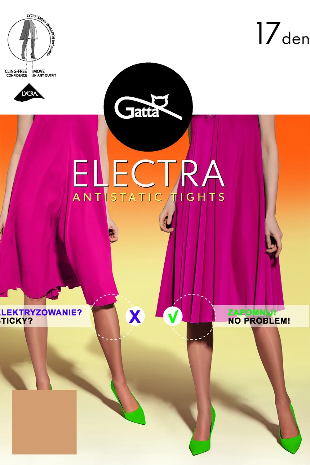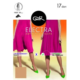 Punčochové zboží značky Gatta, model Electra, vyrobené z 90% polyamidu, 10% elastanu, s vyznačenými špičkami, 17 DEN, dámské, vyznačené kalhotky.