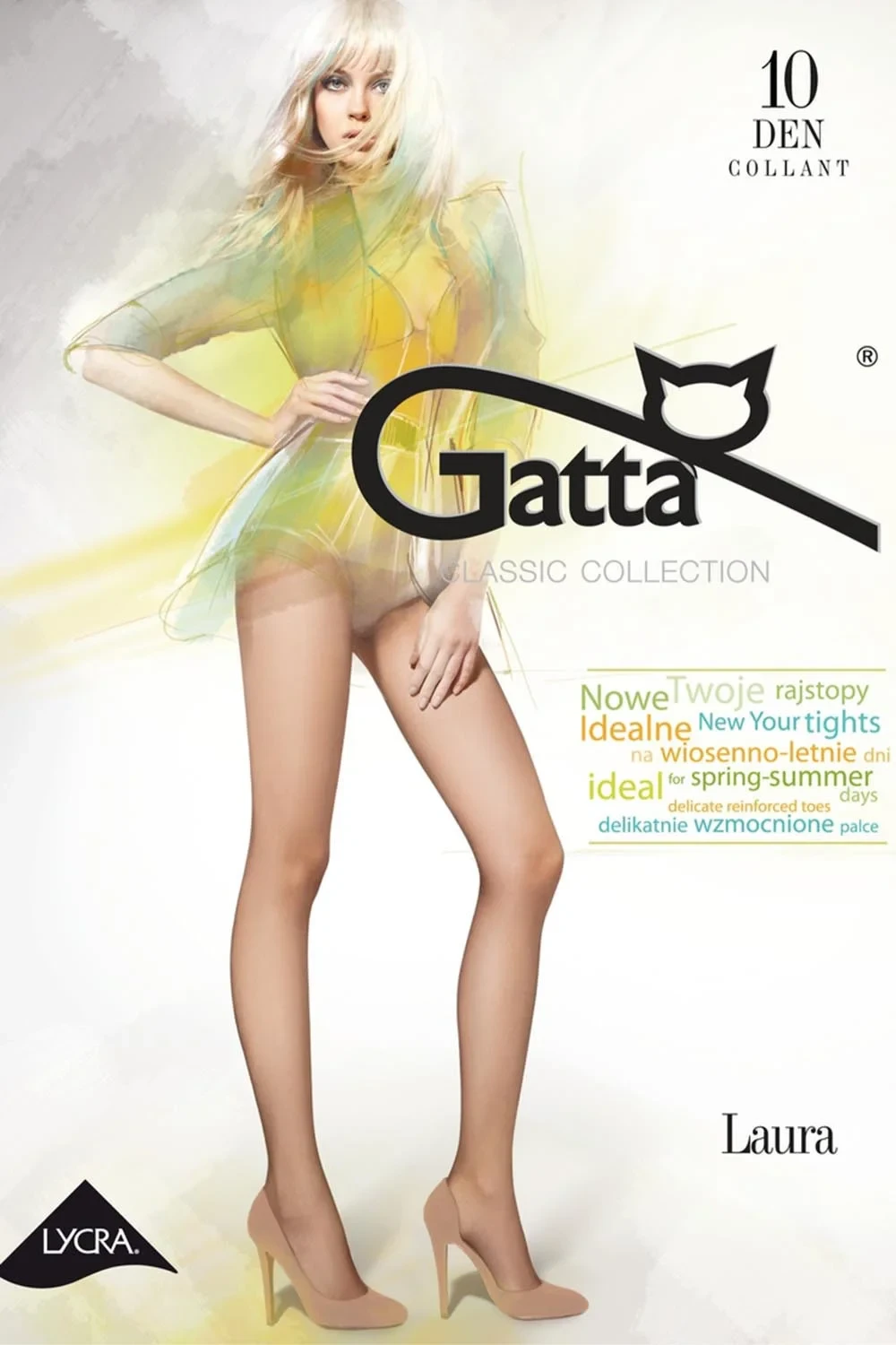 Punčochové zboží značky Gatta, model Laura 10, vyrobené z 88 % polyamidu a 12 % elastanu, tenké jarní punčochové zboží s vyznačenými špičkami, tloušťka 10 DEN, ženské, vyznačené kalhotky.