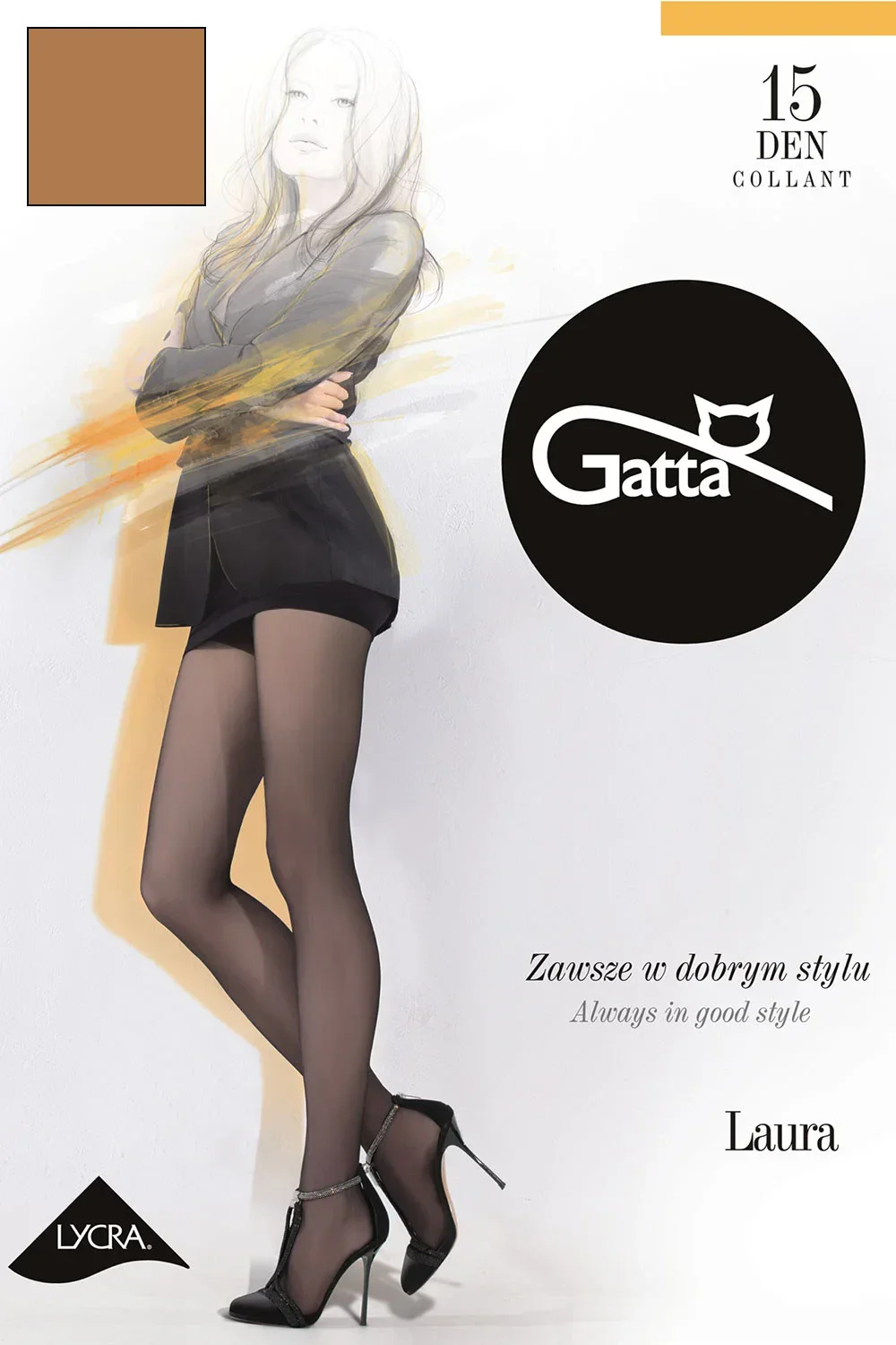 Punčochové zboží značky Gatta, model Laura 15, vyrobené z 87 % polyamidu a 13 % elastanu, s vyznačenými špičkami, tloušťka 15 DEN, pro ženy, vyznačené kalhotky.