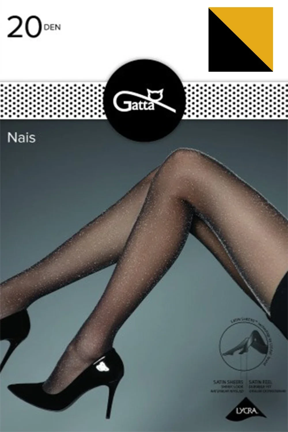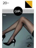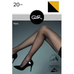 Punčochové zboží značky Gatta, model Nais, vyrobené z 69% polyamidu, 4% metalizované příze, 27% elastanu, bez vyznačených špiček, 20 DEN, dámské, bez vyznačených nohaviček.