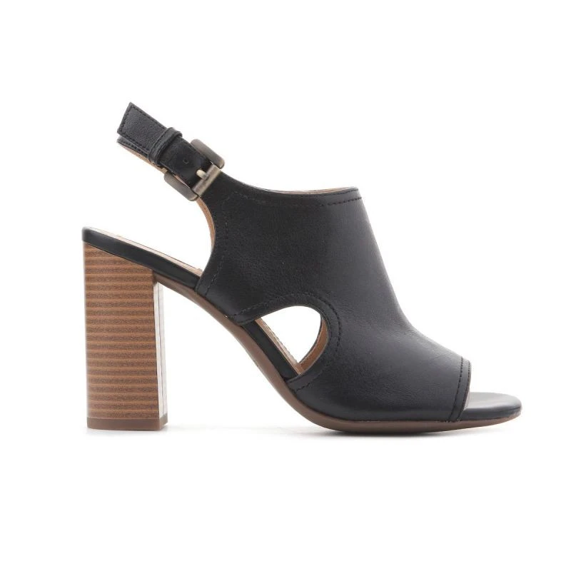Dámská obuv z černé kůže na vysokém 9 cm podpatku. Svršek je na nártu vysoký. Na boku kovová přezka pro nastavení pásku na patě. Stylová elegance! Technologie Geox Respira - patentovaná perforovaná podrážka obuvi, postavená na mikroporézní membráně, která absorbuje a odvádí pot, aniž by do boty pronikala voda.