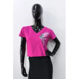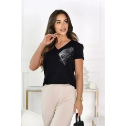 Efektowny nadruk motyla, umieszczony subtelnie na lewej stronie klatki piersiowej, dodaje t-shirtowi kobiecego uroku i oryginalności. Klasyczny krój z dekoltem w serek sprawia, że model ten jest uniwersalny i łatwo łączy się zarówno z jeansami, jak i elegancką spódnicą czy marynarką.To must-have w garderobie każdej nowoczesnej kobiety, która ceni styl i wygodę w jednym.