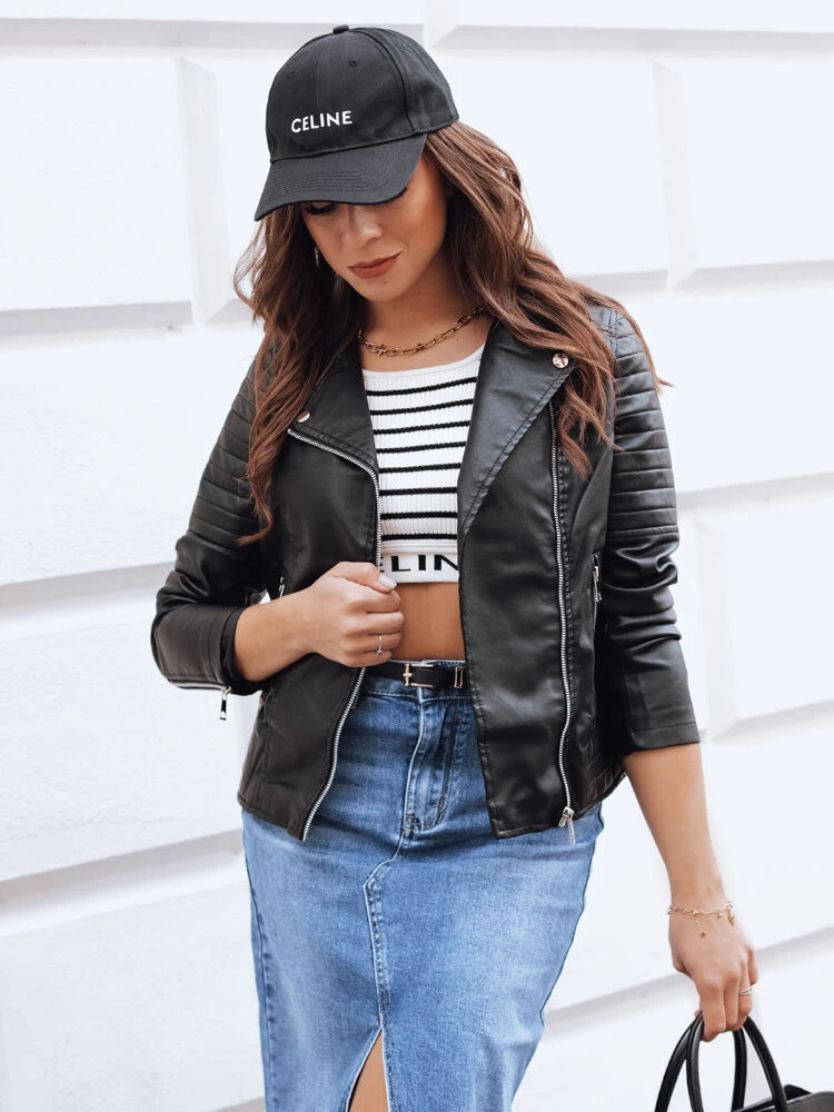 Klasická černá kožená motorkářská bunda s kapsami na zip, přiléhavou siluetou, módním prošíváním na rukávech a dokonalým doplňkem každodenních outfitů. Černá motorkářská bunda bude vypadat skvěle jak ležérně s tričkem a džínami, tak elegantně s košilí nebo šaty.