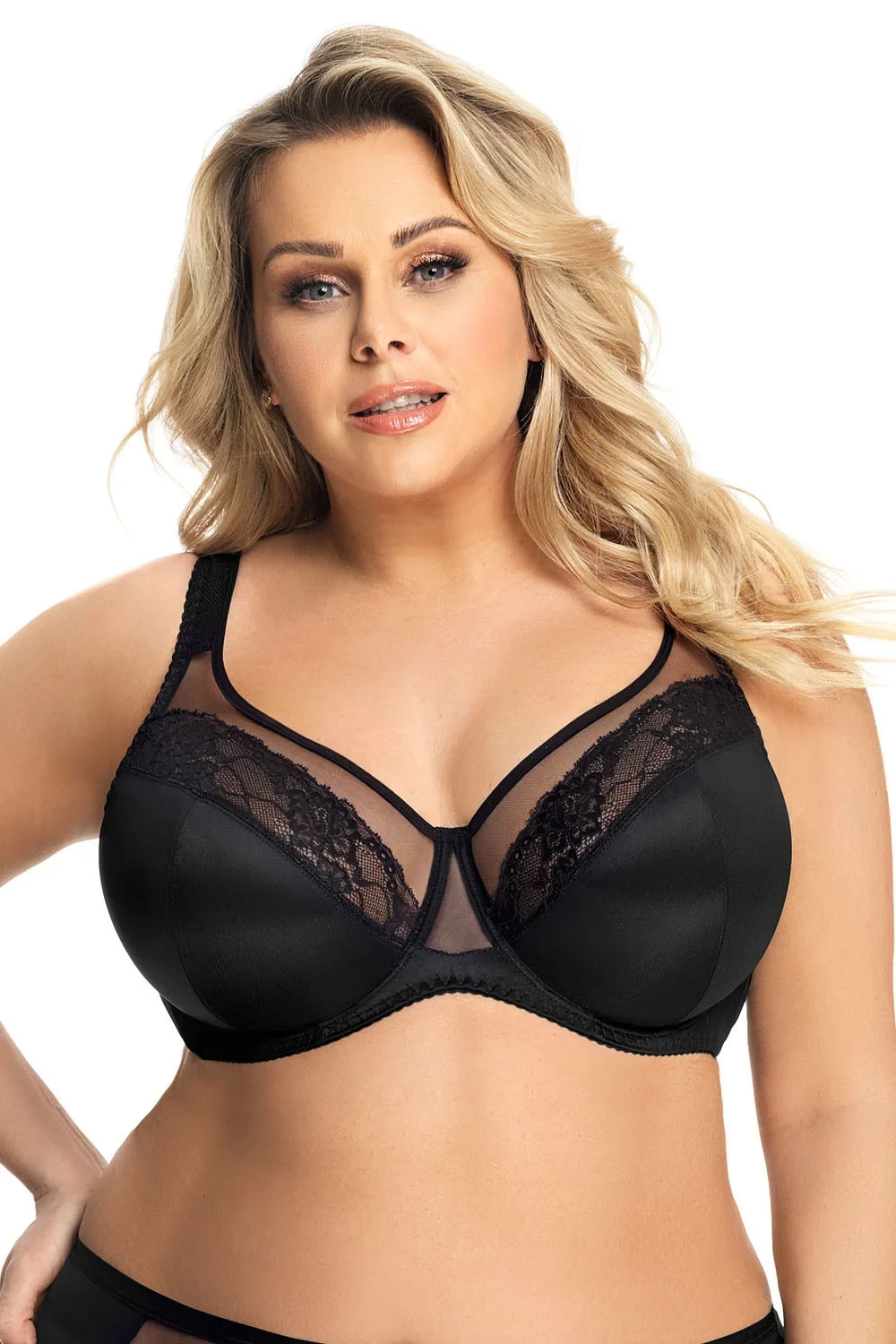 Tato podprsenka značky Gorsenia, model K441 Luisse, má drátky, které podporují a tvarují prsa. Svislé kostice na bocích. Výrobek má nastavitelná ramínka bez možnosti odepnutí. Zapínání na háčky. Místo zapínání: na zádech. 2 řady svislých háčků. 3 stupně vodorovných háčků. Výrobek je vyroben z 90 % z polyamidu, 7 % z elastanu, 3 % z polyesteru. Vlastnosti výrobku: elegantní maxi velikost měkká široká ramínka. Dámský výrobek.