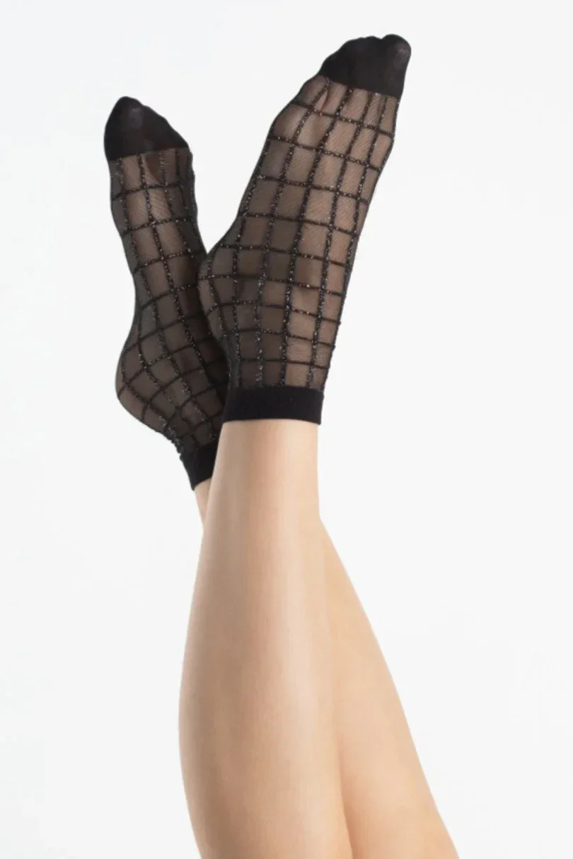 Ponožky z jemných tmavých bloků lemovaných stříbrnou lesklou nití.