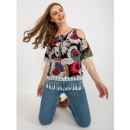 Černá halenka s potiskem a vázáním ve výstřihu .