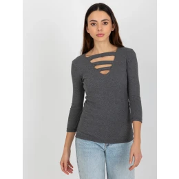 Tmavě šedá pruhovaná halenka s průstřihy ve výstřihu .