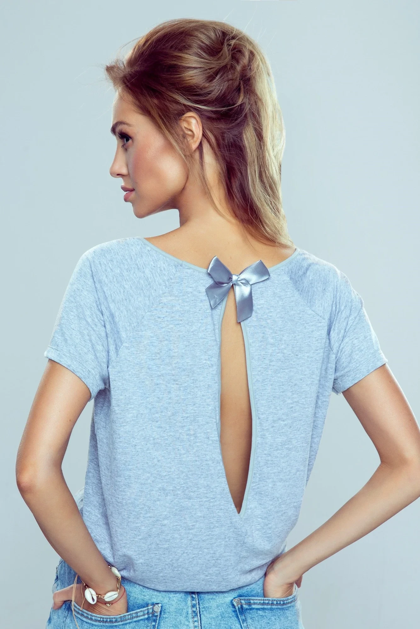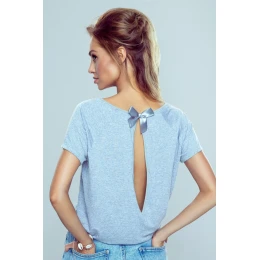 Okouzlující šedá halenka s krátkými rukávy a svůdným průstřihem na zádech. Top zvýrazněný malou, sladkou saténovou mašličkou. Měkká a kvalitní tkanina. Složení: 95 % viskóza, 5 % elastan.