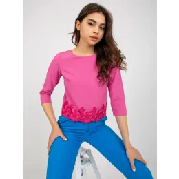Růžová společenská halenka s ozdobným lemováním.