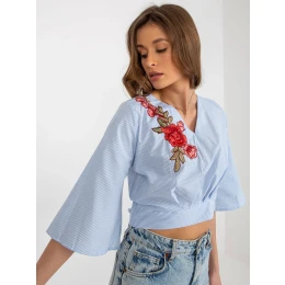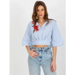 Světle modrá a bílá pruhovaná krátká společenská halenka .