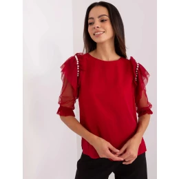 Bordó společenská halenka se síťovanými rukávy .