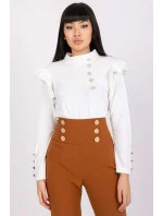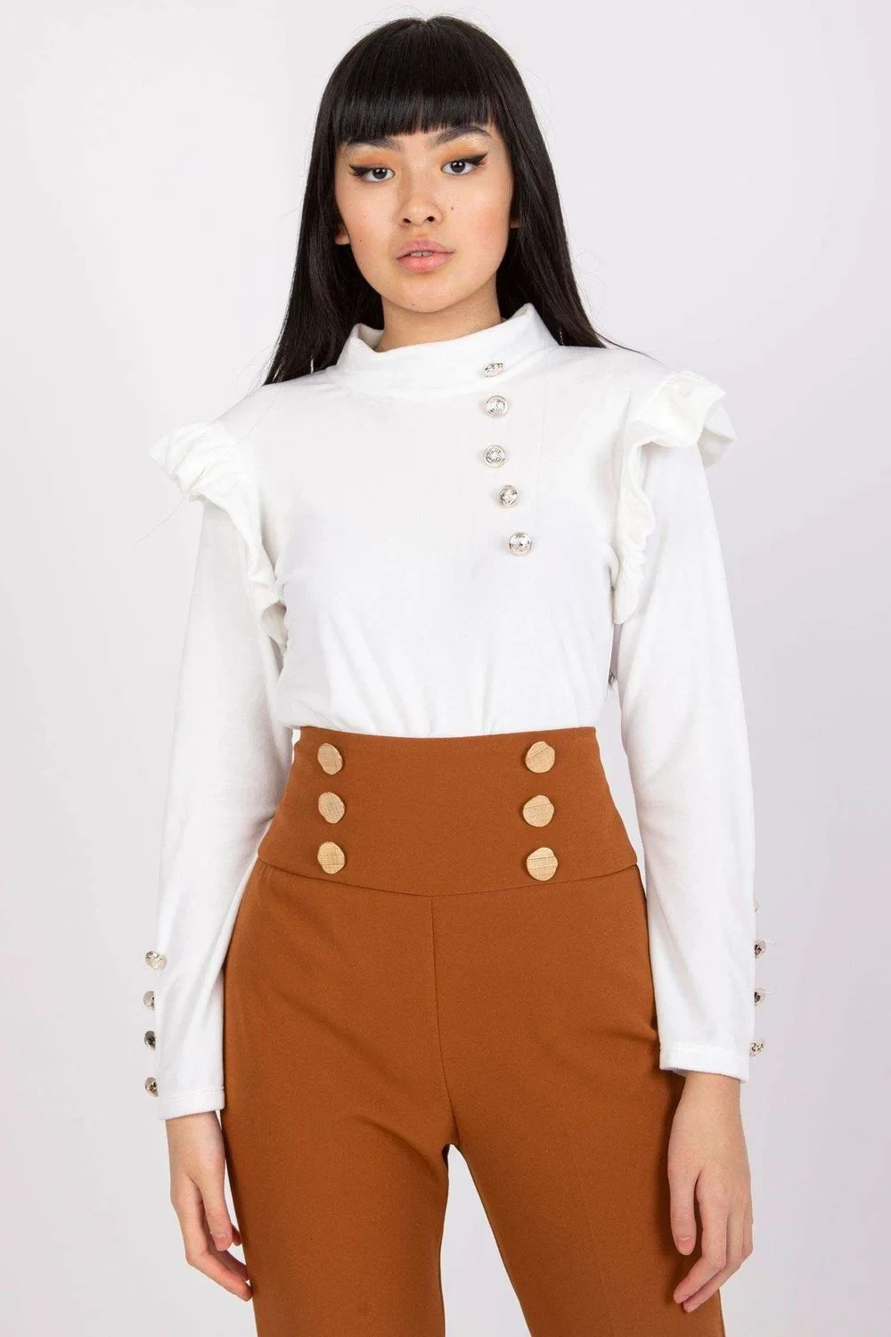 Velurová halenka rovného střihu s dlouhými rukávy. Ozdobné volánky na ramenou. Ozdobné knoflíky vpředu a na rukávech.