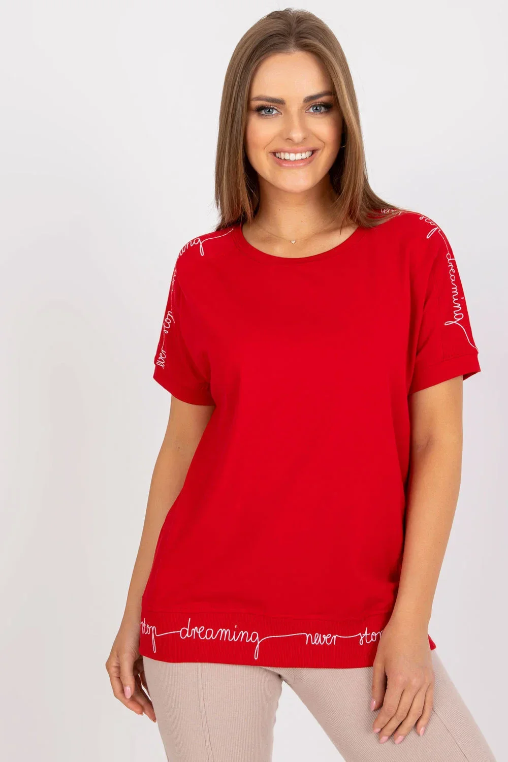 Halenka s krátkými rukávy a kulatým výstřihem. Ozdobné nápisy na spodní části a na rukávech. Ideální volba pro každodenní nošení.