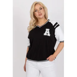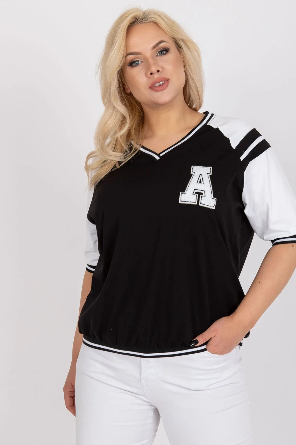 Halenka pro každodenní nošení se 3/4 rukávy a srdíčkovým výstřihem. Blůza je zakončena žebrovanými manžetami a nášivkou na přední straně.