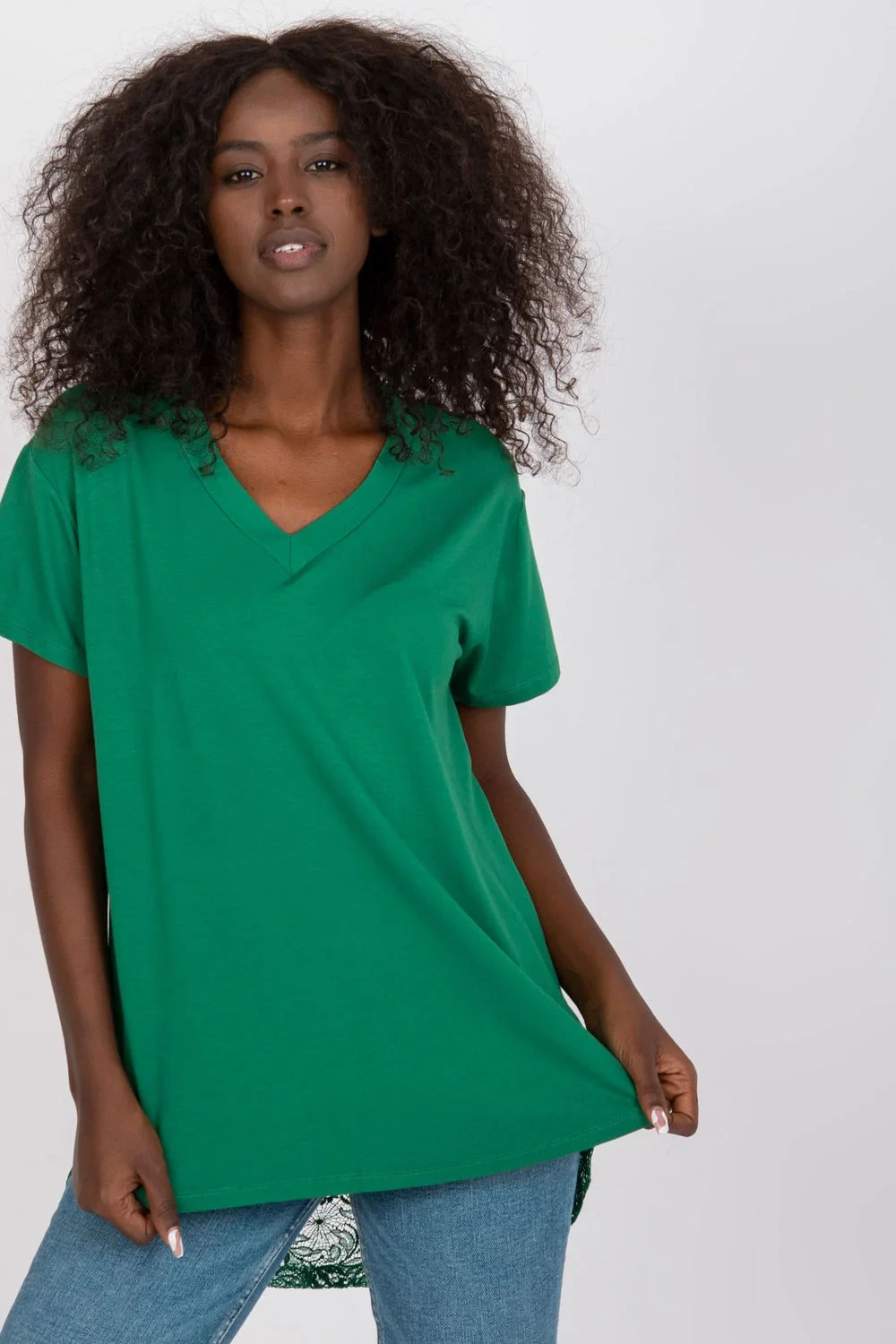 Halenka rovného střihu s krátkými rukávy. Sýrový výstřih, prodloužená záda z krajky.