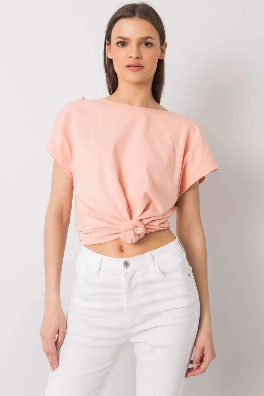 Halenka s krátkými rukávy a kulatým výstřihem. Zadní díl s hlubokým výřezem lemovaným ozdobným volánem.