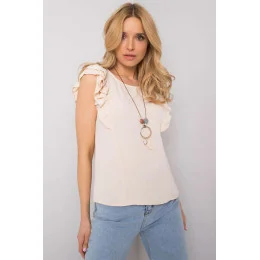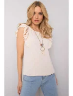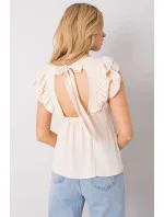 Halenka s krátkými rukávy v podobě volánku. Kulatý výstřih, výstřih na zádech se zavazováním.
