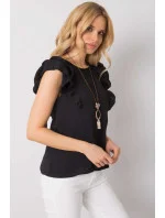 Halenka s krátkými rukávy v podobě volánku. Kulatý výstřih, výstřih na zádech se zavazováním.