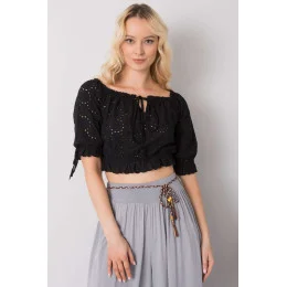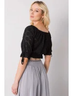Zajímavá halenka s krátkými rukávy z látky s prolamovaným vzorem. Zavazování vpředu a na rukávech.