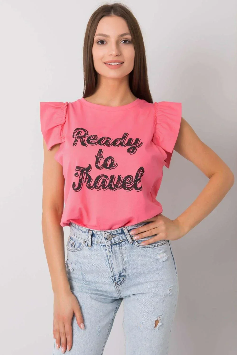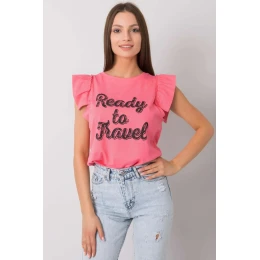 Halenka s krátkými rukávy v podobě volánku a kulatým výstřihem. Ozdobný nápis na přední straně.