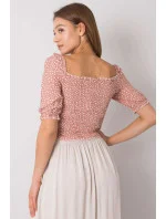 Krátká halenka vypasovaného střihu s krátkými rukávy. Halenka s véčkovým výstřihem, záhyby a vázáním na přední straně.