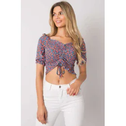 Krátká halenka vypasovaného střihu s krátkými rukávy. Halenka s véčkovým výstřihem, záhyby a vázáním na přední straně.