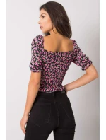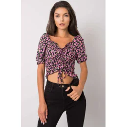 Krátká halenka vypasovaného střihu s krátkými rukávy. Halenka s véčkovým výstřihem, záhyby a vázáním na přední straně.