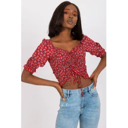 Krátká halenka vypasovaného střihu s krátkými rukávy. Halenka s véčkovým výstřihem, záhyby a vázáním na přední straně.