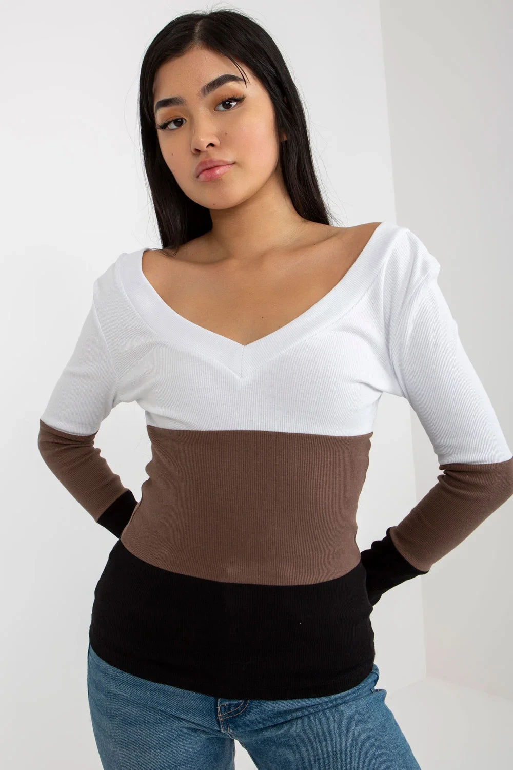 Halenka s dlouhými rukávy a srdíčkovým výstřihem. Halenka z žebrované tkaniny ve třech barvách.