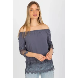Halenka s 3/4 rukávy a výstřihem ve španělském stylu. Rukávy a spodní lem halenky s ozdobným lemem.