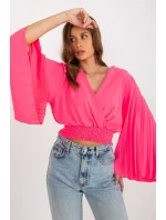 Halenka s obálkovým výstřihem a dlouhými širokými rukávy. Plně nařasené rukávy, široká podpůrná guma ve spodní části halenky.