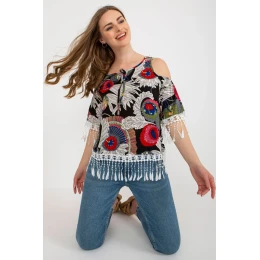 Letní halenka z potištěné látky s 3/4 rukávy a kulatým výstřihem. Halenka se zavazováním ve výstřihu a ozdobnými střapci.