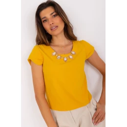 Halenka s krátkými rukávy ve tvaru bufetu a kulatým výstřihem. Na přední straně zdobená šperky.